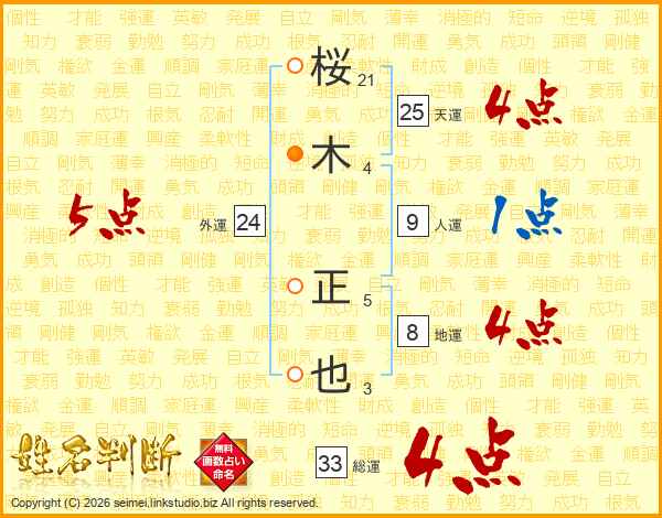 桜(21画)木(4画) 正(5画)也(3画)