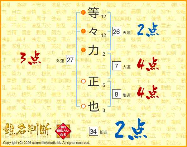 あなたの人生を表す1番重要な運勢です。生涯を通じて影響する総合運となり、主に50歳以降の晩年期に影響を及ぼします。苗字と名前の合計画数。