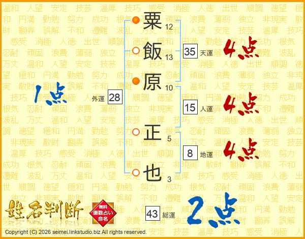 粟飯原正也さんの総運は43画の2点!