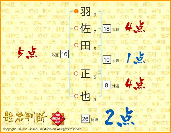 羽(6画)佐(7画)田(5画) 正(5画)也(3画)