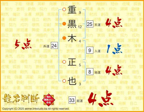 重(9画)黒(12画)木(4画) 正(5画)也(3画)