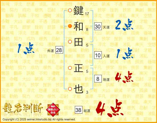 鍵(17画)和(8画)田(5画) 正(5画)也(3画)