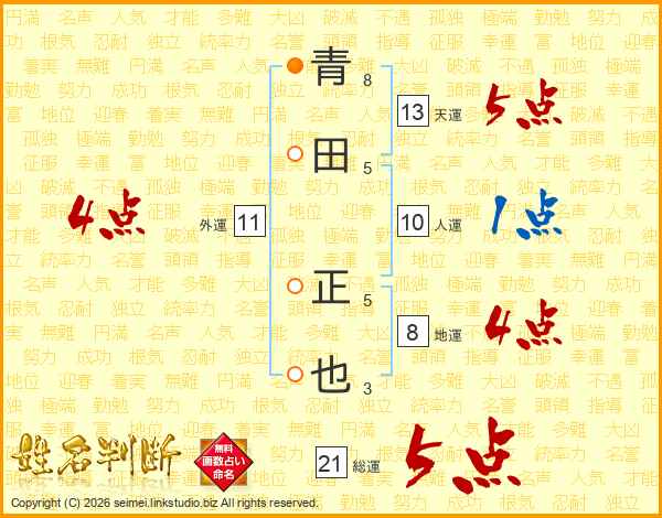 青田正也さんの総運は21画の5点!