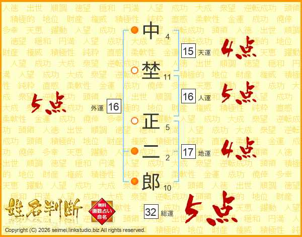あなたの人生を表す1番重要な運勢です。生涯を通じて影響する総合運となり、主に50歳以降の晩年期に影響を及ぼします。苗字と名前の合計画数。