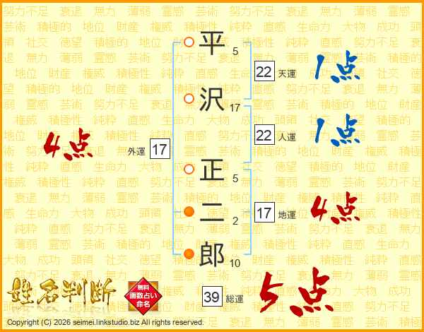 平沢正二郎さんの総運は39画の5点!