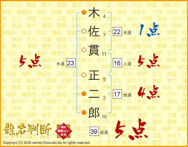 木(4画)佐(7画)貫(11画) 正(5画)二(2画)郎(10画)