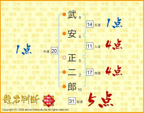 武(8画)安(6画) 正(5画)二(2画)郎(10画)
