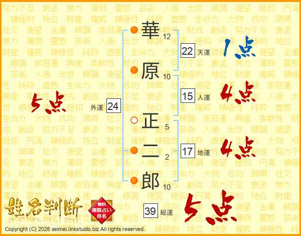 華(12画)原(10画) 正(5画)二(2画)郎(10画)