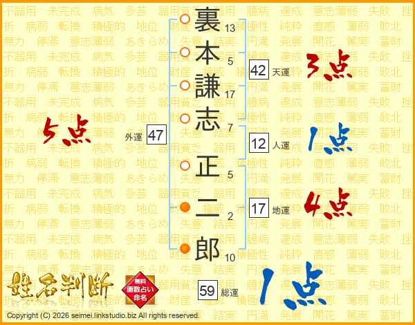 裏(13画)本(5画)謙(17画)志(7画) 正(5画)二(2画)郎(10画)