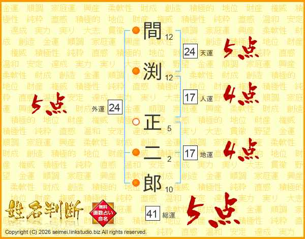 間(12画)渕(12画) 正(5画)二(2画)郎(10画)