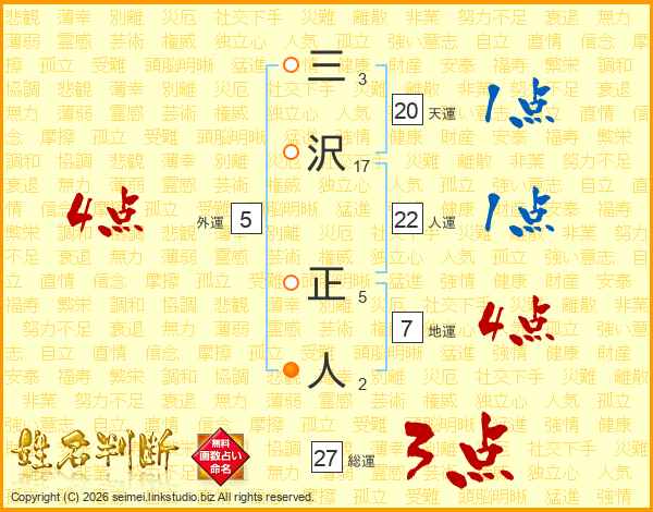 あなたの人生を表す1番重要な運勢です。生涯を通じて影響する総合運となり、主に50歳以降の晩年期に影響を及ぼします。苗字と名前の合計画数。