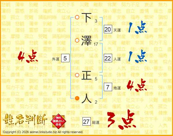 生活面を象徴する運勢です。外部から受ける影響力を表し、結婚運、家庭運や職場、環境への順応性を表します。総運から人運を引いた画数。姓や名が1文字の場合を除く。