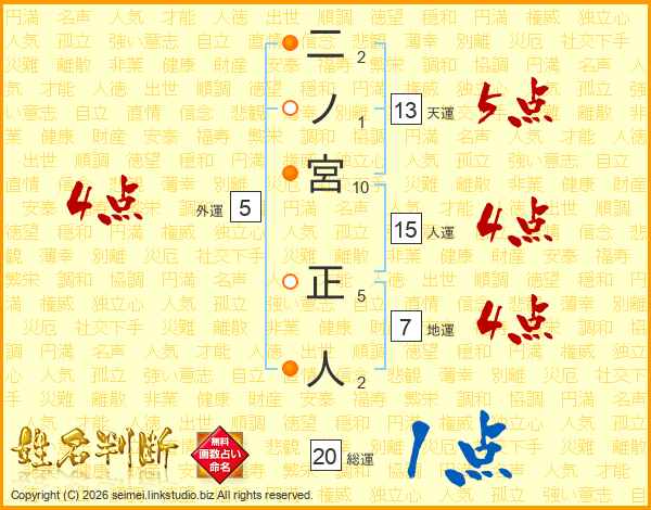 生活面を象徴する運勢です。外部から受ける影響力を表し、結婚運、家庭運や職場、環境への順応性を表します。総運から人運を引いた画数。姓や名が1文字の場合を除く。
