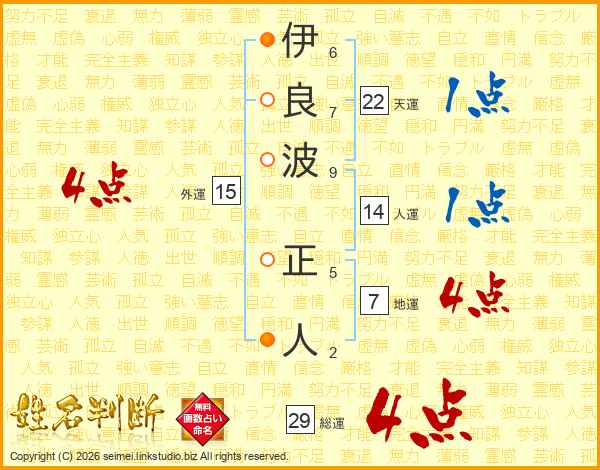 伊(6画)良(7画)波(9画) 正(5画)人(2画)