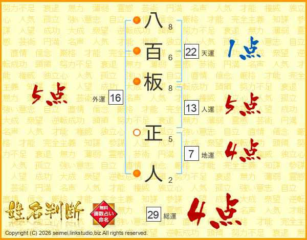八百板正人さんの総運は29画の4点!