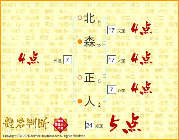 あなたの人生を表す1番重要な運勢です。生涯を通じて影響する総合運となり、主に50歳以降の晩年期に影響を及ぼします。苗字と名前の合計画数。