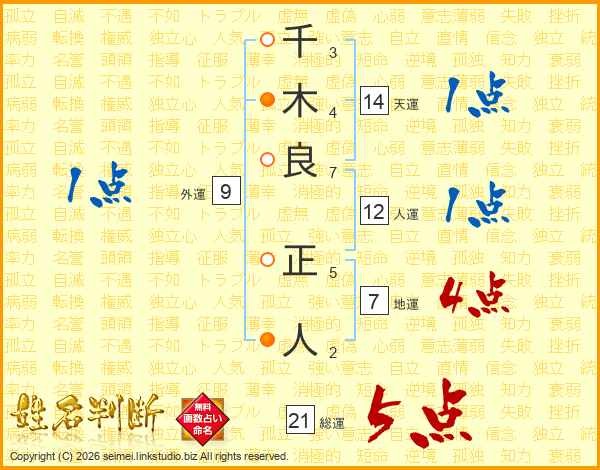 千(3画)木(4画)良(7画) 正(5画)人(2画)