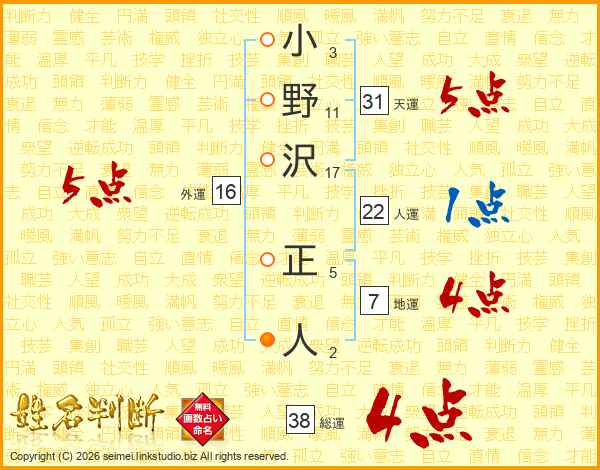 小野沢正人さんの総運は38画の4点!