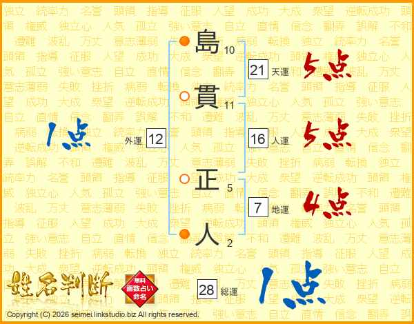 島(10画)貫(11画) 正(5画)人(2画)