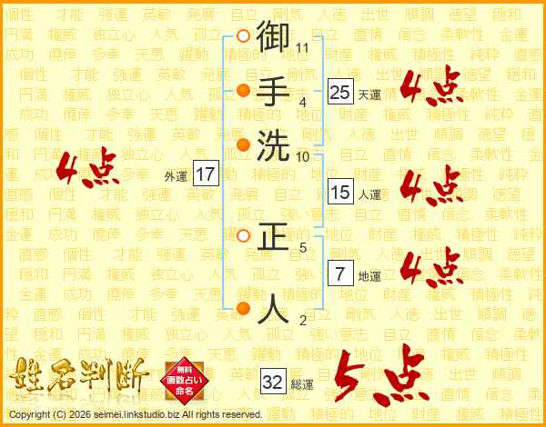 生活面を象徴する運勢です。外部から受ける影響力を表し、結婚運、家庭運や職場、環境への順応性を表します。総運から人運を引いた画数。姓や名が1文字の場合を除く。