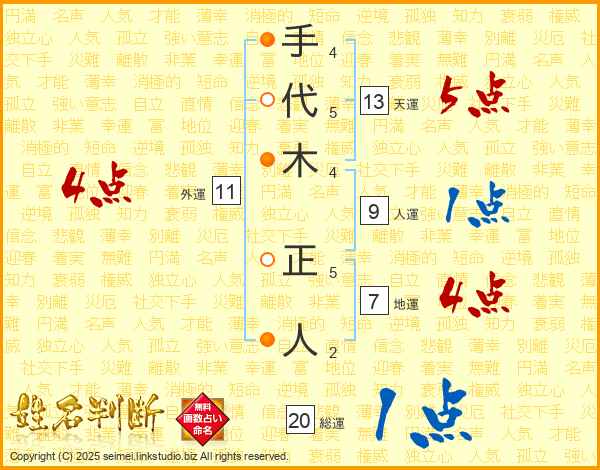 手(4画)代(5画)木(4画) 正(5画)人(2画)
