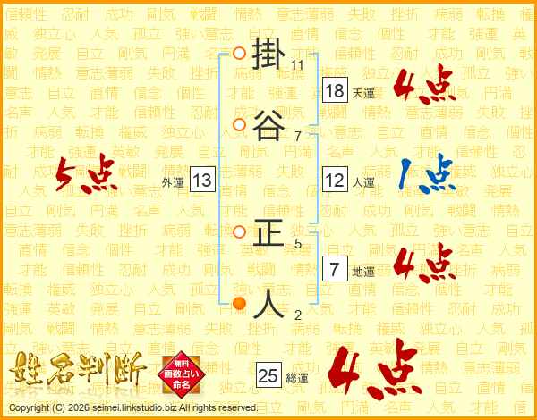 生活面を象徴する運勢です。外部から受ける影響力を表し、結婚運、家庭運や職場、環境への順応性を表します。総運から人運を引いた画数。姓や名が1文字の場合を除く。