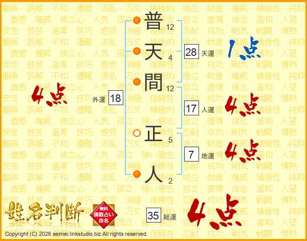 普(12画)天(4画)間(12画) 正(5画)人(2画)