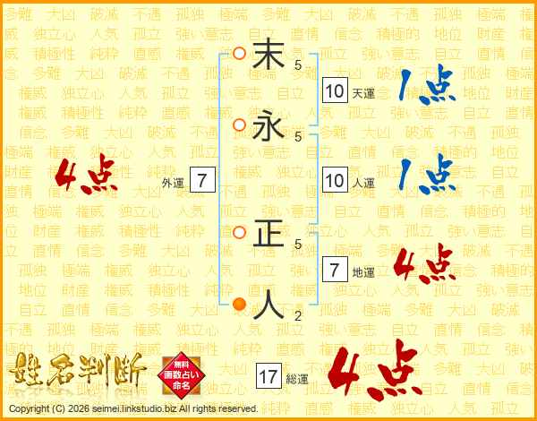 生活面を象徴する運勢です。外部から受ける影響力を表し、結婚運、家庭運や職場、環境への順応性を表します。総運から人運を引いた画数。姓や名が1文字の場合を除く。