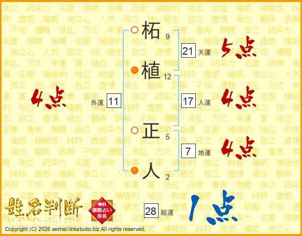 あなたの人生を表す1番重要な運勢です。生涯を通じて影響する総合運となり、主に50歳以降の晩年期に影響を及ぼします。苗字と名前の合計画数。
