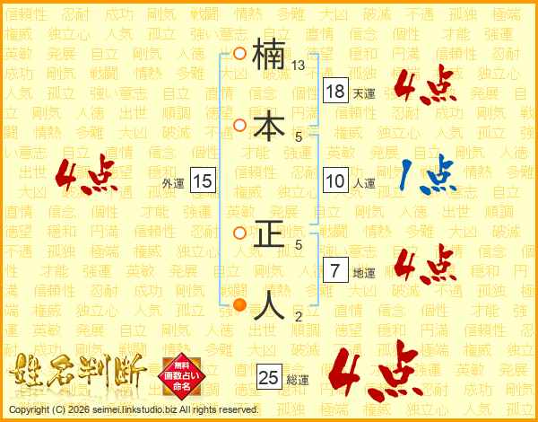 あなたの人生を表す1番重要な運勢です。生涯を通じて影響する総合運となり、主に50歳以降の晩年期に影響を及ぼします。苗字と名前の合計画数。