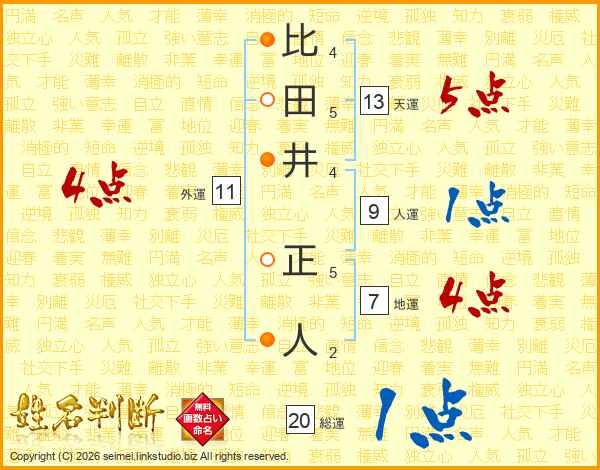 比田井正人さんの総運は20画の1点!