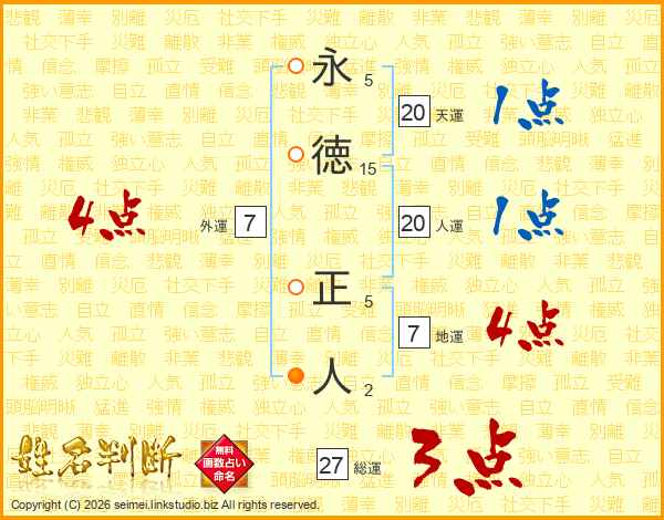 生活面を象徴する運勢です。外部から受ける影響力を表し、結婚運、家庭運や職場、環境への順応性を表します。総運から人運を引いた画数。姓や名が1文字の場合を除く。