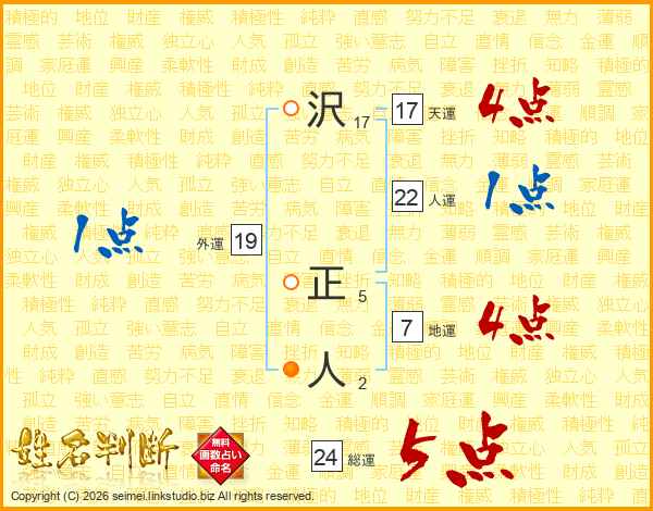 生活面を象徴する運勢です。外部から受ける影響力を表し、結婚運、家庭運や職場、環境への順応性を表します。総運から人運を引いた画数。姓や名が1文字の場合を除く。