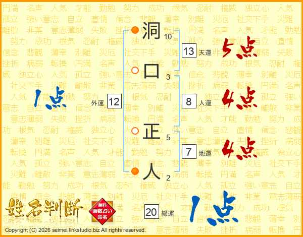 あなたの人生を表す1番重要な運勢です。生涯を通じて影響する総合運となり、主に50歳以降の晩年期に影響を及ぼします。苗字と名前の合計画数。