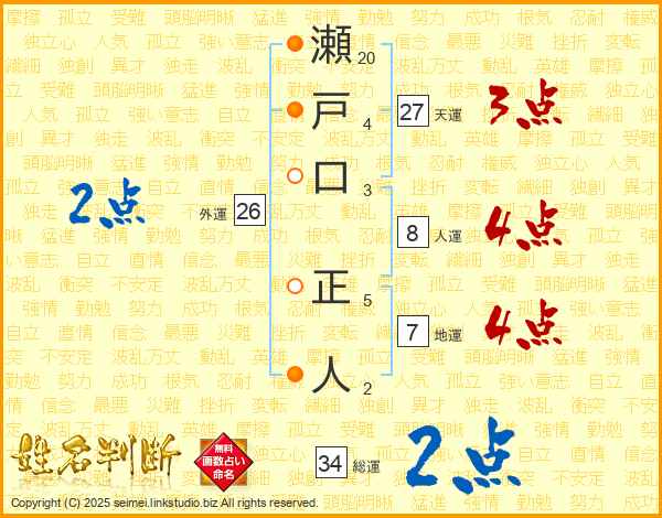 瀬(20画)戸(4画)口(3画) 正(5画)人(2画)
