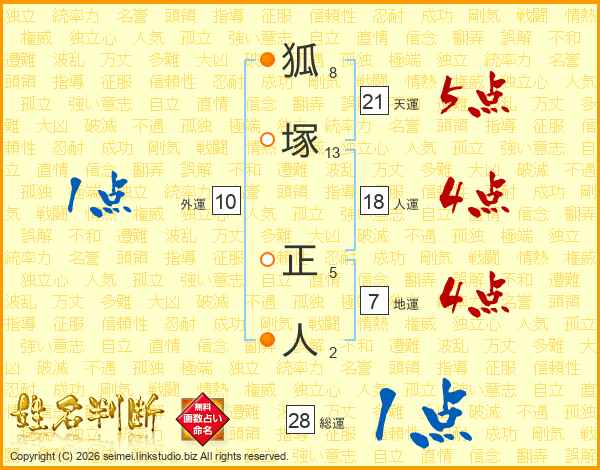 生活面を象徴する運勢です。外部から受ける影響力を表し、結婚運、家庭運や職場、環境への順応性を表します。総運から人運を引いた画数。姓や名が1文字の場合を除く。