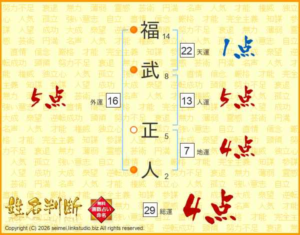 あなたの人生を表す1番重要な運勢です。生涯を通じて影響する総合運となり、主に50歳以降の晩年期に影響を及ぼします。苗字と名前の合計画数。