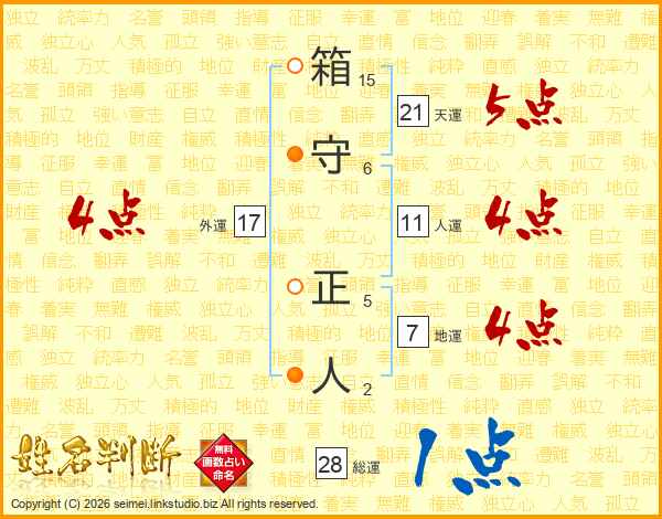 生活面を象徴する運勢です。外部から受ける影響力を表し、結婚運、家庭運や職場、環境への順応性を表します。総運から人運を引いた画数。姓や名が1文字の場合を除く。