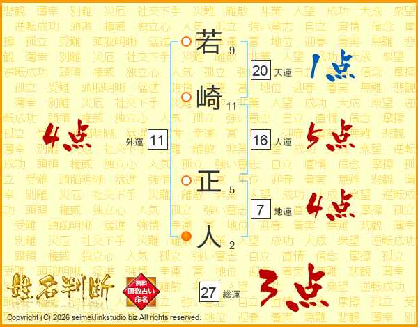 あなたの人生を表す1番重要な運勢です。生涯を通じて影響する総合運となり、主に50歳以降の晩年期に影響を及ぼします。苗字と名前の合計画数。
