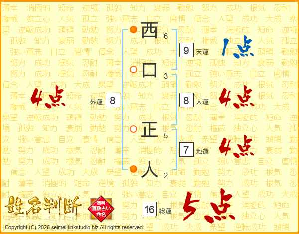 生活面を象徴する運勢です。外部から受ける影響力を表し、結婚運、家庭運や職場、環境への順応性を表します。総運から人運を引いた画数。姓や名が1文字の場合を除く。