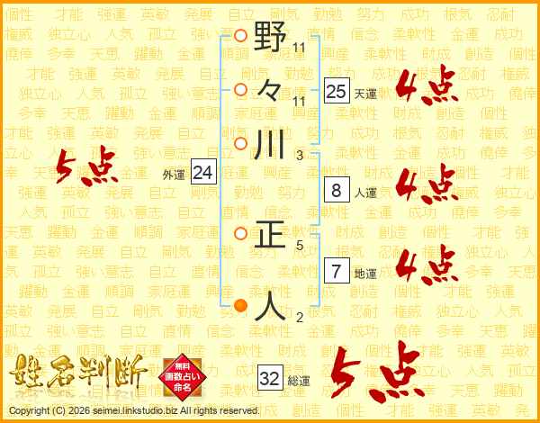 生活面を象徴する運勢です。外部から受ける影響力を表し、結婚運、家庭運や職場、環境への順応性を表します。総運から人運を引いた画数。姓や名が1文字の場合を除く。