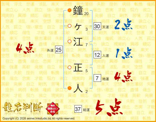 鐘ヶ江正人さんの総運は37画の5点!
