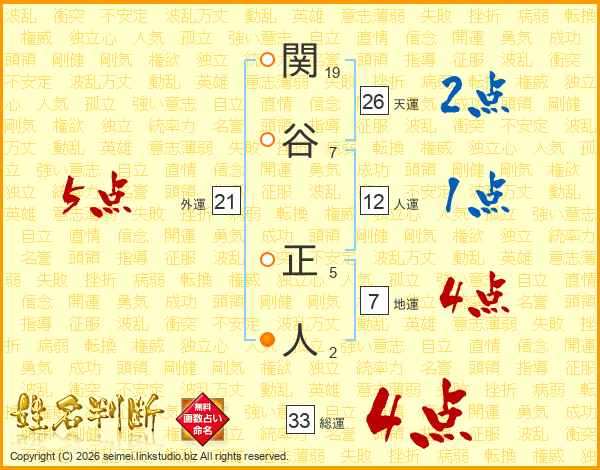 あなたの人生を表す1番重要な運勢です。生涯を通じて影響する総合運となり、主に50歳以降の晩年期に影響を及ぼします。苗字と名前の合計画数。