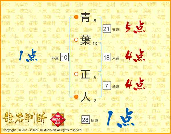 青(8画)葉(13画) 正(5画)人(2画)