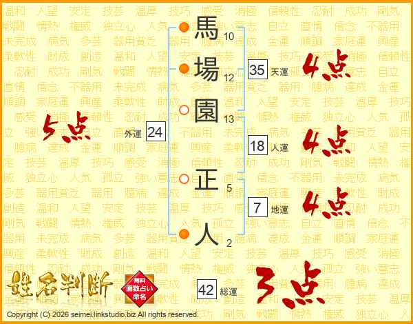 馬(10画)場(12画)園(13画) 正(5画)人(2画)