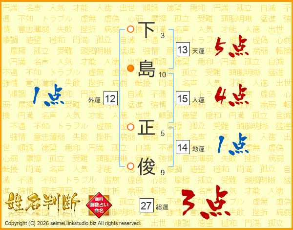 あなたの人生を表す1番重要な運勢です。生涯を通じて影響する総合運となり、主に50歳以降の晩年期に影響を及ぼします。苗字と名前の合計画数。