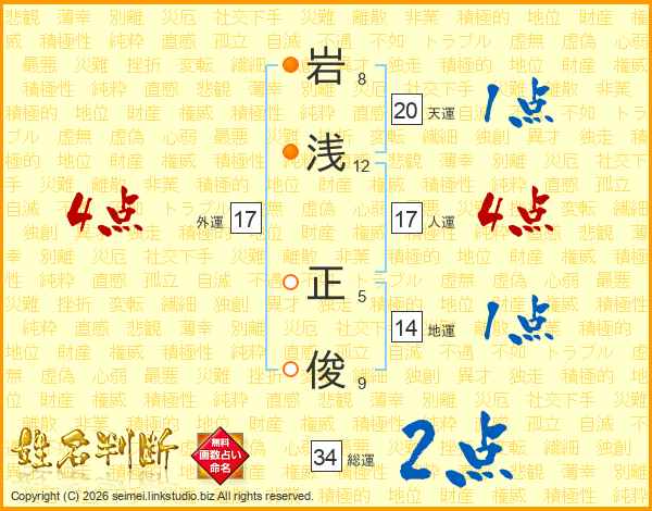 岩(8画)浅(12画) 正(5画)俊(9画)