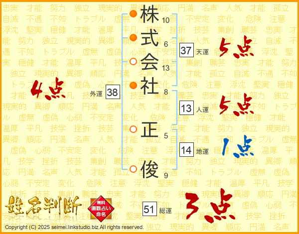 株(10画)式(6画)会(13画)社(8画) 正(5画)俊(9画)