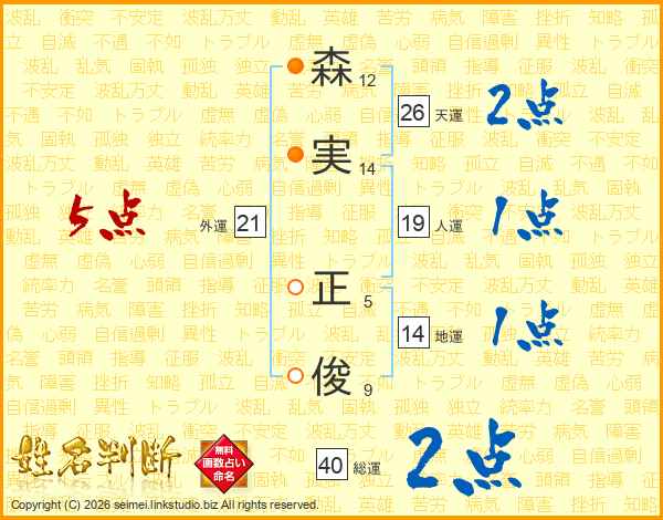 森(12画)実(14画) 正(5画)俊(9画)