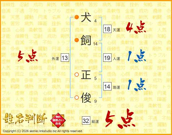犬飼正俊さんの総運は32画の5点!